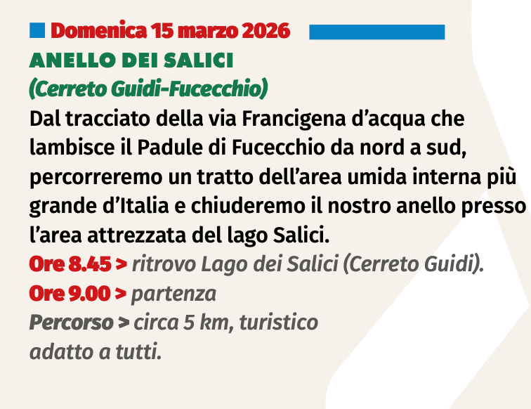 Dal tracciato della Via Francigena d’acqua che lambisce il Padule di Fucecchio da da nord a sud, percorreremo un tratto dell’area umida interna più grande d’Italia e chiuderemo il nostro anello presso l’area attrezzata del Lago Salici.